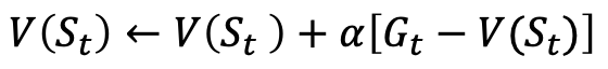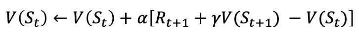 2.8 TD 학습 (Temporal Difference Learning) 이때, 시간차학습(TD)방법이 유용하다. TD학습법은 다음수식처럼 episode보상의 누적합 없이도 바로 가치함수를 update할 수 있다.