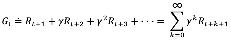 2.3 Reward 앞서 Agent가 어떤 행동을 했을 때, 환경으로부터 "보상"을 받는다. 이때, 우린 Gt를 어떤 시점으로부터 받는 보상의 누적합이라 정의하자. 따라서 Gt는 아래와 같이 정의된다. 이때 감소율(discount factor) γ(0~1값)를 도입해 수식을 조금 변형할 수 있다. γ의 도입으로 먼 미래의 보상보다 가까운 미래의 보상을 더 중시해 다룰 수 있게 된다.