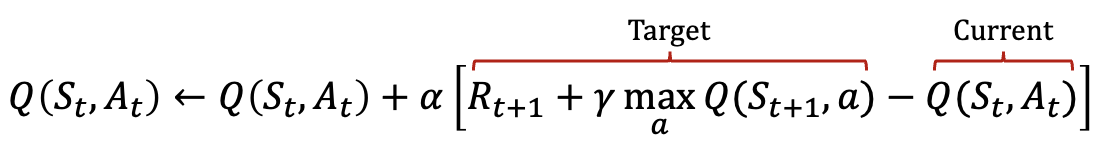 아래수식처럼 target과 현재가치함수(current)의 차이를 줄이면 올바른 Q함수를 학습할 것이다.