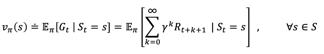 2.5 Value Function (가치함수) 가치함수란 주어진 policy 𝛑 내에 특정 상태 s에서부터 앞으로 얻을 수 있는 보상의 누적총합의 기댓값을 의미한다. 아래 수식과 같이 나타낼 수 있는데, 앞으로 얻을 수 있는 보상의 총합의 기댓값은 기대누적보상(Expected Cumulative Reward)라고도 한다.