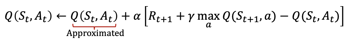 아래 수식처럼 Q함수 부분을 신경망으로 근사해 희소성 문제를 해결했고, 심지어 Atari게임을 사람보다 더 잘 플레이하는 Agent를 학습하기도 했다.
