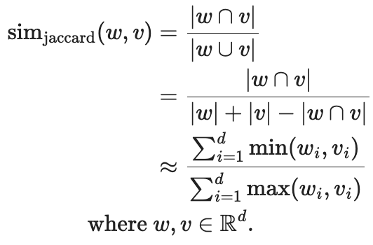 ∙ 수식에서 분자는 두 집합의 교집합크기이고, 분모는 두 집합의 합집합니다. - 이때, 특징벡터의 각 차원이 집합의 요소(element)이다. - 다만, 각 차원에서의 값이 0 or 0이 아닌 값이 아닌, 수치 자체에 대해 jarccard similarity를 구하고자 할 때는, 2번째 줄의 수식처럼 두 벡터의 각 차원의 숫자에 대해 min, max연산으로 계산할 수 있다.