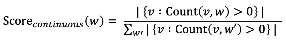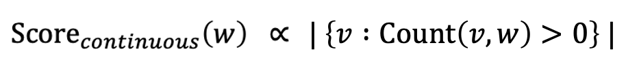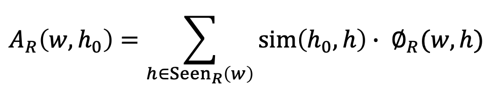이를 위해 thesaurus나 thesaurus기반 Lesk알고리즘에 의존하지 않고 data를 기반으로 간단하게 선택선호도를 구하는 방법을 알아보자. 술어 w, 표제어 h, 두 단어 사이의 관계 R이 tuple로 주어질 때, 선택관련도를 아래와 같이 정의할 수 있다. 이때, 가중치 ØR(w,h)는 동일하게 1이나 아래처럼 IDF를 사용해 정의할 수도 있다. 또한 sim함수는 일전의 코사인유사도나 jarccard유사도를 포함, 다양한 유사도함수를 사용할 수 있다. 유사도비교를 위해 SeenR(w)함수로 대상단어를 선정하기에 corpus에 따라 유사도를 구할 수 있는 대상이 달라지며 이를 통해 thesaurus없이도 쉽게 선택선호도를 계산할 수 있게 된다.