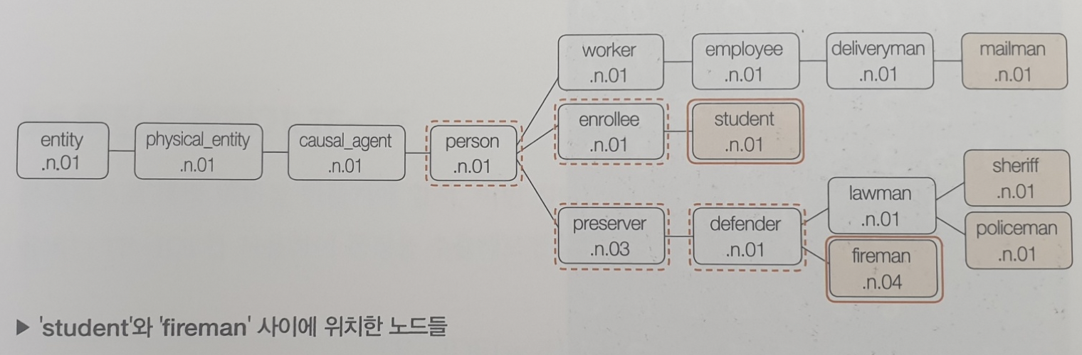 가장 먼저 언급한 WordNet의 그래프구조에서 단어사이의 거리를 측정, 이를 바탕으로 단어사이의 유사도를 구하는 방법에 대해 알아보다.
