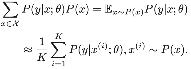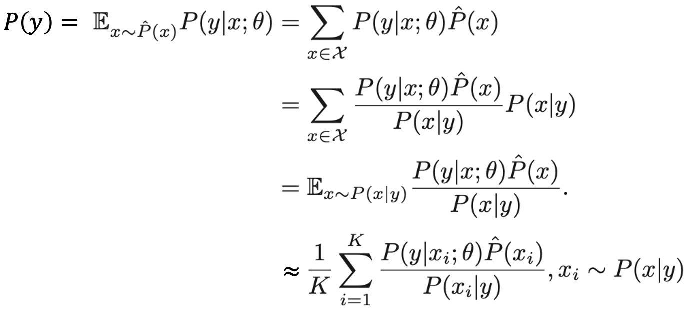 주변 분포의 속성을 통해 위의 수식은 항상 참이다. 이는 조건부확률로 나타낼 수 있고, 좀 더 나아가면 기대값표현으로도 바꿀 수 있다. 그 후 K번 sampling 해 Monte Carlo Sampling으로 근사해 표현할 수 있다. 위의 수식을 NMT에 적용해보자. ∙src문장 x, tgt문장 y로 이뤄진 양방향병렬코퍼스 𝑩 와 ∙S개의 tgt문장 y로만 이뤄진 단일언어코퍼스 ℳ이 있다 가정하자. 이때, 목적함수를 최대화하는 동시에 주변분포에 따른 제약조건 또한 만족시켜야한다. [Objectiv; 목표] 위의 수식을 DSL과 마찬가지로 λ와 함께 S(θ)와 같이 표현해 기존 손실함수에 추가하면 아래와 같다. 이제 DSL과 유사하게 p̂(x)와 p̂(y)가 등장한다. ∙p̂(x): 단일언어코퍼스로 만든 LM으로 계산한 각 문장들의 확률값 위의 수식에 따르면 p̂(x)를 통해 src문장 x를 sampling해 신경망 θ를 통과시켜 P(y | x; θ)를 구해야 될 것처럼 보인다. 하지만, 아래처럼 조금 더 다른 방법으로 접근한다.