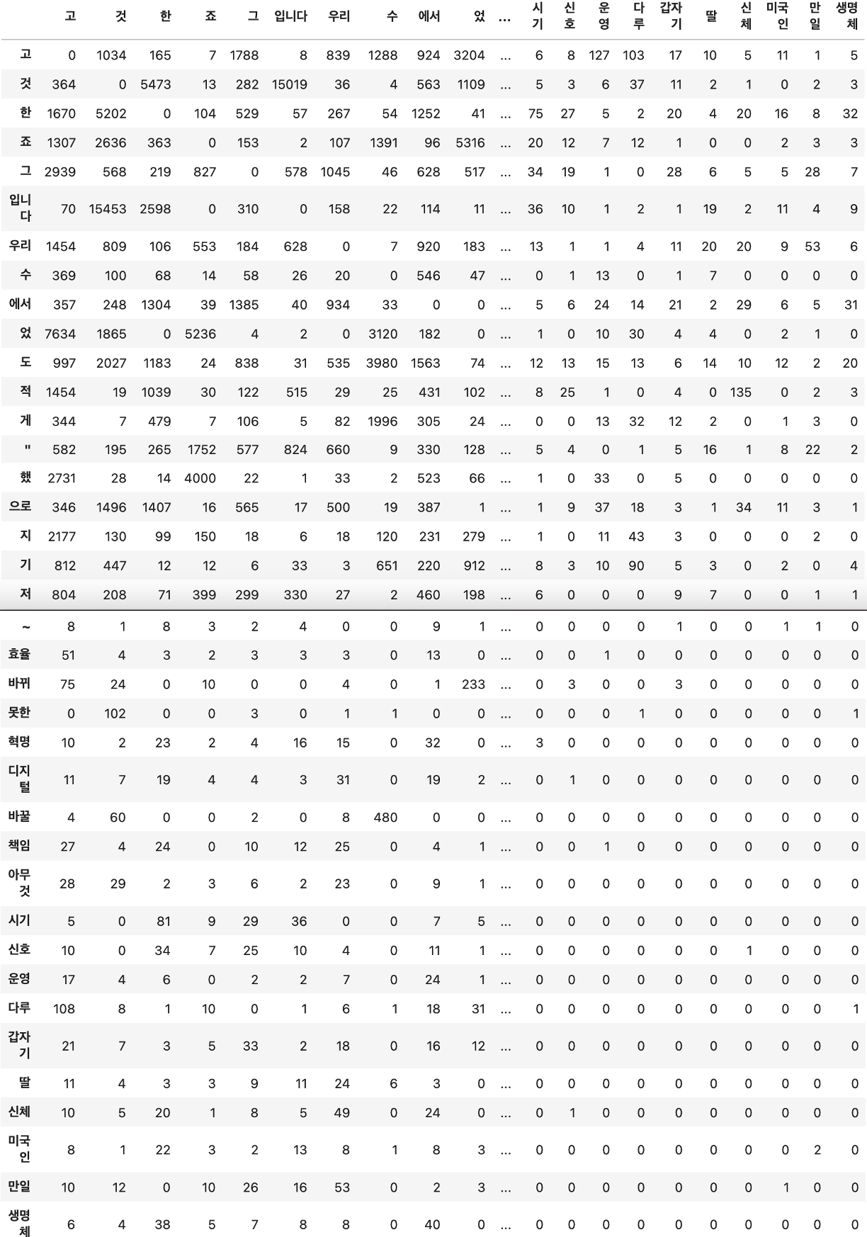 return pd.DataFrame(data, index=vocab, columns=vocab)