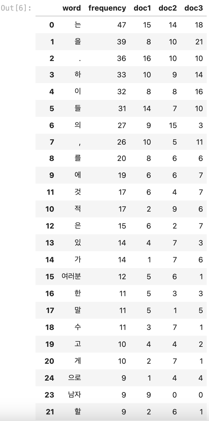 [TF-IDF를 위해 작성한 get_term_frequency()함수를 활용해 동시발생정보를 통해 벡터를 만드는 코드]