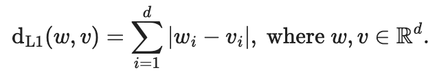 7.1 L1 Distance (Manhattan Distance) L1 Distance는 L1 norm을 사용하는 것으로 Manhattan Distance라고도 한다. 이 방법은 두 벡터의 각 차원별 값의 차이의 절대값을 모두 합한 값이다. 코드로 나타내면 아래와 같다.