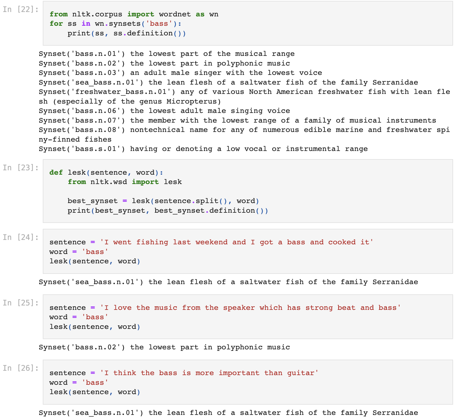 <예제> In [26] 전까지는 잘 작동하지만, In [26]은 전혀 다른 의미로 예측하는 것을 볼 수 있다. Lesk Algorithm은 명확한 장단점을 갖는다. - 장점) WordNet과 같이 잘 분류된 사전이 있다면, 쉽고 빠르게 WSD(단어 중의성 해소)문제를 해결할 수 있다. - 단점) 사전의 단어 및 의미에 관한 설명에 크게 의존하게되고, 설명이 부실하거나 주어진 문장에 큰 특징이 없다면 WSD능력이 크게 떨어진다.