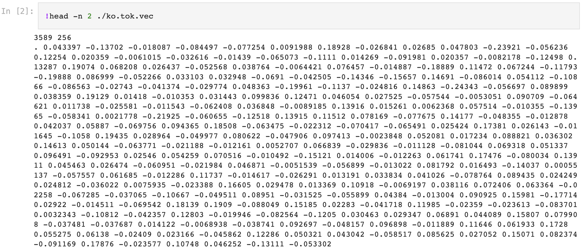 <출력> 앞쪽의 출현빈도가 높은 단어들은 대부분의 값이 잘 채워져 있는 것을 알 수 있다. 뒤쪽의 출현빈도가 낮은 단어들은 대부분의 값이 0으로 채워져 있음을 알 수 있다.