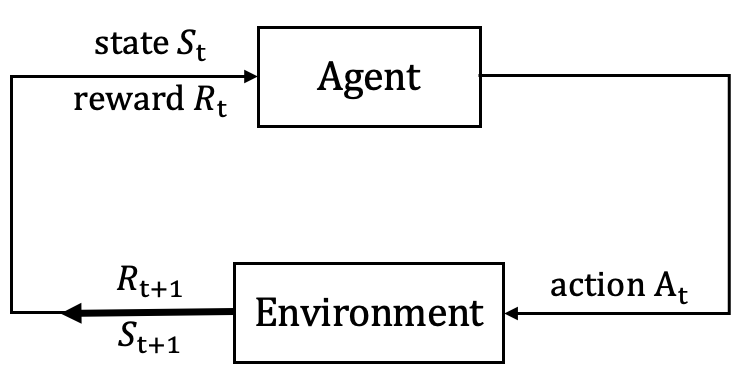 처음 상태인 St(t=0)을 받고, ∙Agent는 자신의 policy에 따라 action At를 선택한다. ∙Environment는 Agent로부터 선택된 At를 받아 보상 Rt+1과 새롭게 바뀐 상태St+1을 반환한다.