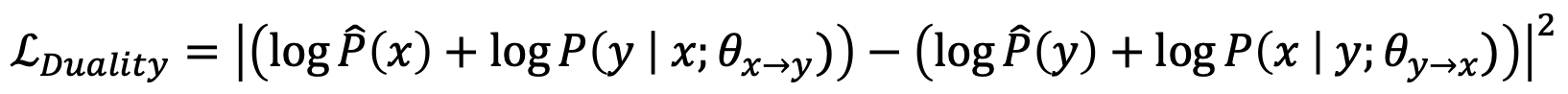 따라서 위와 같은 MSE손실함수를 만들 수 있다. 이 함수는 Bayes정리에따른 제약조건의 양 변의 값의 차이를 최소화한다. ∙ 위의 수식에서 우리가 동시에 훈련시키는 신경망파라미터로 logP(y | x; θx→y)와 logP(x | y; θy→x)를 구하고 ∙ monolingual corpus를 통해 별도로 이미 훈련시켜 놓은 LM으로 logp̂(x)과 logp̂(y)를 근사시킬 수 있다. 이 부가적 제약조건의 손실함수를 기존의 손실함수에 추가해 동시해 최소화하면, 아래와 같이 표현가능하다.