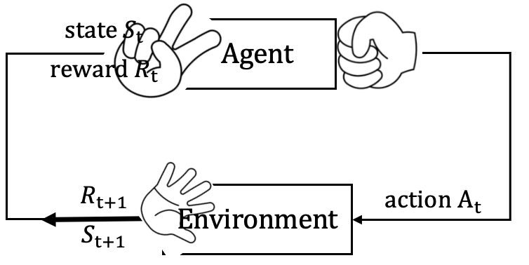 예를들어 사람마다 가위바위보를 내는 패턴이 다르기에 가위바위보 상대방에 따라 전략이 바뀌어야 하므로 ∙ 상대방이 첫 상태 S0를 결정한다. ∙ Agent는 S0에 따라 행동 A0를 선택한다. ∙ 상대방은 상대방의 정책에 따라 가위/바위/보 중 하나를 낸다. ∙ 승패가 결정, 환경으로부터 방금 선택한 행동에 대한 보상 R1을 받는다. ∙ update된 상태 S1을 얻는다.