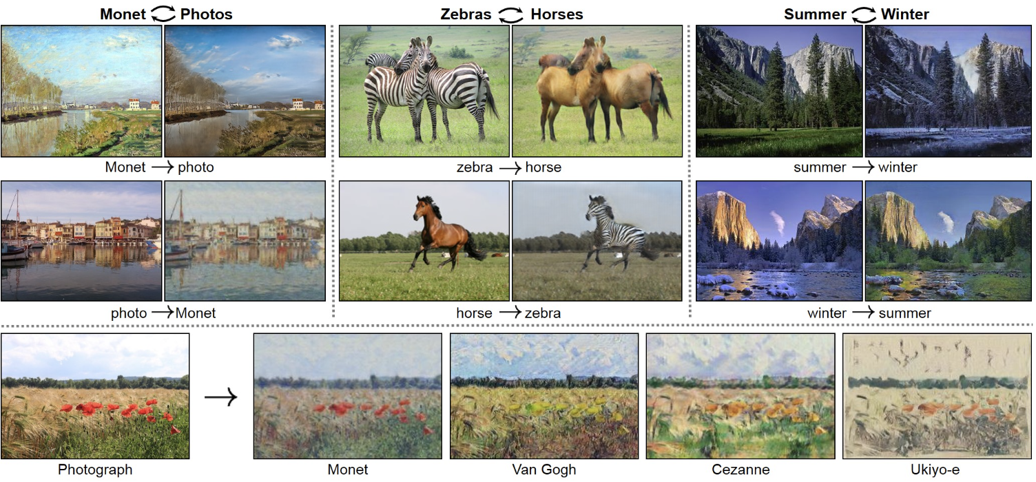 1.2 CycleGAN 번역 외 분야에서도 Duality를 활용할 수 있는데, ∙ Vision분야에서 소개한 [CycleGAN; 2017]에 대해 소개해보고 한다. CycleGAN이란 아래그림처럼 짝지어지지않은 두 도메인의 이미지가 있을때, X도메인의 image를 Y도메인의 image로 변환하는 방법이다. 사진의 전반적 구조는 유지하되, 모네의 화풍으로 바꾸거나 말을 얼룩말이나 민무늬로 바꿔주기도 한다.X→Y와 Y→X 모두 각각 생성자 G, F와 판별자 Dx, Dy를 갖고있기에 min/max 게임을 수행한다. G는 x를 입력으로 받아 ŷ으로 변환한다. F는 y를 입력으로 받아 x̂ 으로 변환한다. Dx는 x̂ 이나 x를 입력으로 받아 합성 여부를 판단한다. CycleGAN의 동작개요