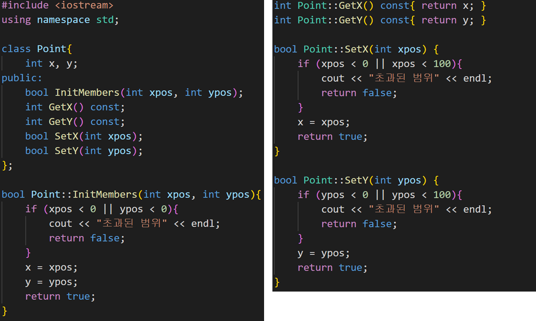 § access함수: GetX, SetX처럼 멤버변수를 private으로 선언, 클래스 외부에서 멤버변수 접근을 목적으로 정의하는 함수