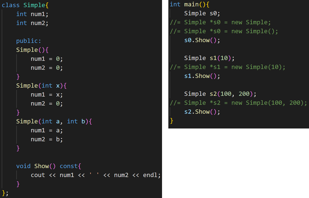 이때, 매개변수가 선언되어 있지 않은 생성자의 경우, Simple s0();과 같은 선언은 불가능하다.