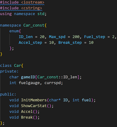 - 클래스 정의: Car.cpp 처럼 멤버함수의 정의와 소스파일을 저장, 컴파일 되도록 한다.