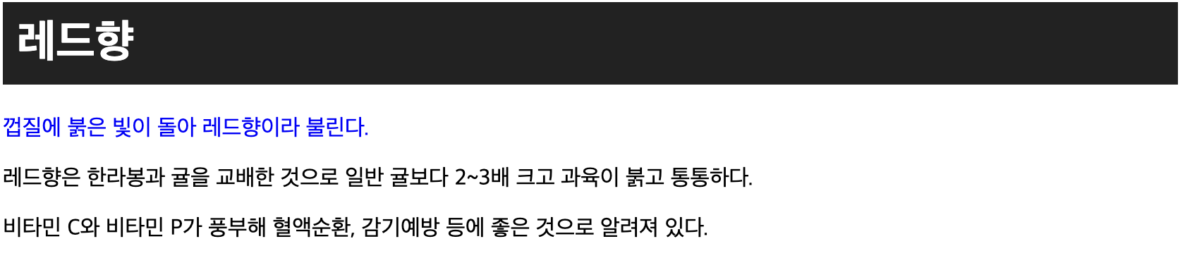 Ex)<style> body { font-size: 20px; /*전체 글자 크기*/ } h1 { font-family: 바탕; /*글꼴*/ font-size: 3em; /*글자 크기*/ } .accent { font-size: 150%; /*글자 크기*/ font-weight: 800; /*글자 굵기*/ } .italic { font-style: italic; /*글자 스타일*/ } </style> ... <h1>레드향</h1> <p>껍질에 붉은 빛이 돌아 <span class="accent">레드향</span>이라 불린다.</p> <p>레드향은 한라봉과 귤을 교배한 것으로</p> <p class="italic">일반 귤보다 2~3배 크고, 과육이 붉고 통통하다.</p>