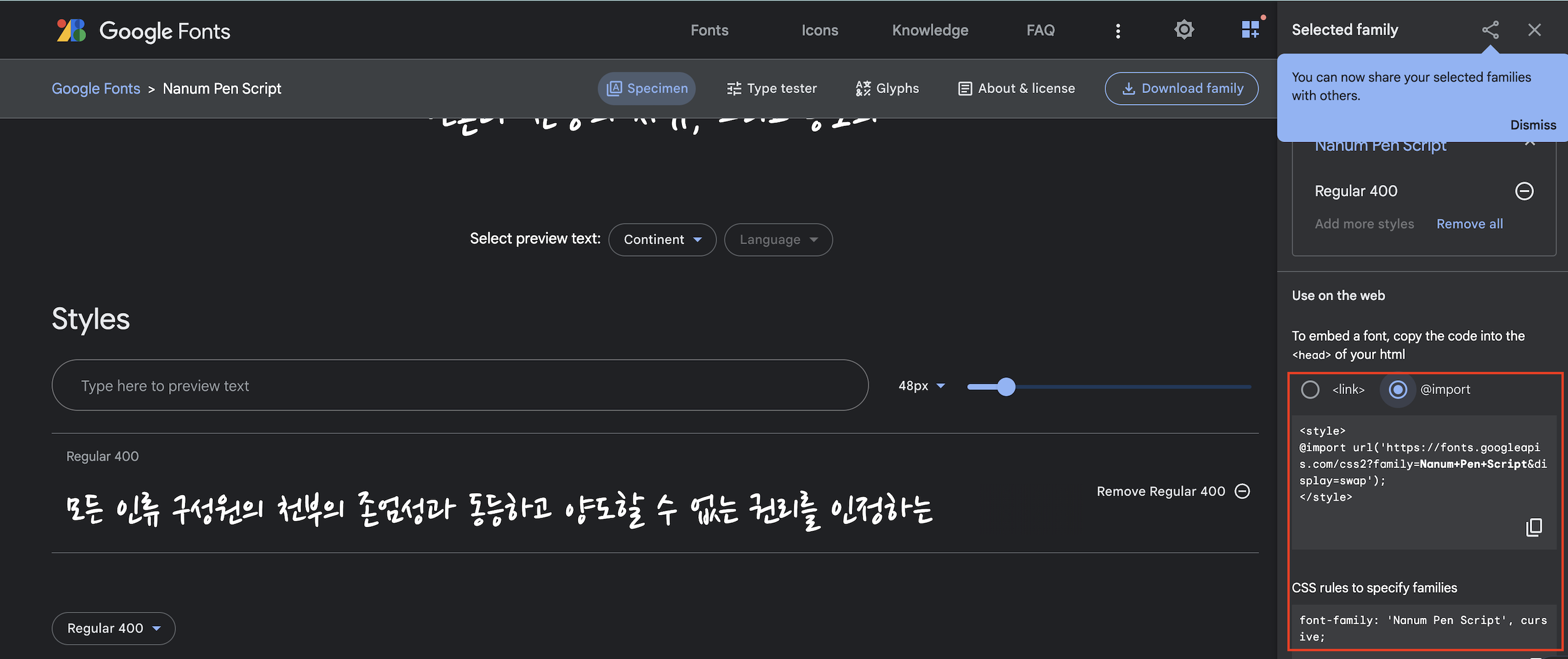 <style> @import url('https://fonts.googleapis.com/css2?family=Nanum+Pen+Script&display=swap'); h1 { font-size: 60px; font-weight: bold; font-family: 'Nanum Pen Script', cursive; } </style>