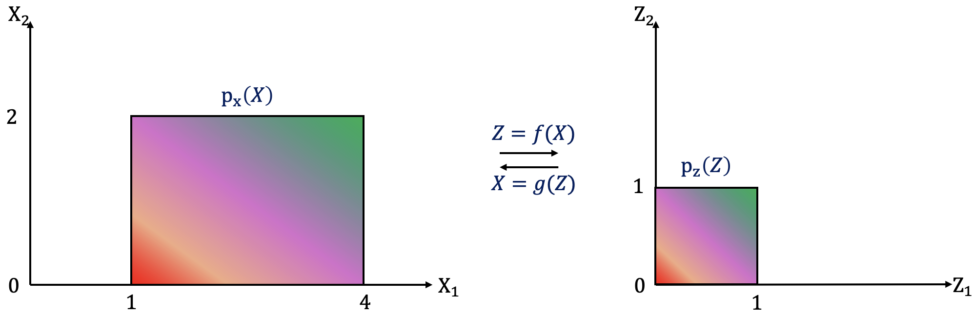 이 함수를 주어진 분포영역에서 적분하면 1이 된다. (x1의 범위: [1,4] , x2:[0.2]) 따라서 아래와 같이 잘 정의된 확률분포를 정의할 수 있다: 이 분포를 이동하고 scaling하여 단위 정사각형 Z에 대해 정의한다 가정하자. 이를 위해 새로운 z=(z1, z2)변수와 X의 각 point를 정확히 Z의 한 Point에 mapping하는 함수 f를 정의할 수 있다: 이런 함수를 가역함수(invertible function)라 한다. 즉, 모든 z를 이에 해당하는 x로 다시 mapping가능한 g함수가 존재한다. (변수변환에 필수적.) 이 g함수가 없으면 두 공간사이를 mapping할 수 없다. 이때, pz(z) = ((3z1+1)-1)(2z2)/9 = 2z1z2/3로 변환가능하다. 다만, pz(z)를 단위면적에 대해 적분하면 아래와 같은 문제에 봉착한다: 1/6값이 나왔기에, 더이상 유효한 확률분포가 아니다. (적분결과가 1이 되어야함.) 원인:변환된 확률분포 영역이 원본의 1/6로 작아졌기 때문. 해결:새로운 확률분포의 상대적면적변화에 해당하는 정규화계수를 곱해야함 → 변환에 의한 부피변환 = Jacobian Matrix의 절댓값.