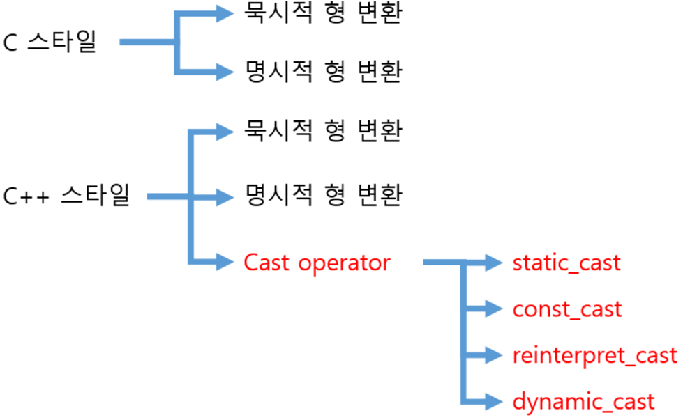 - 명시적 캐스트 (explicit cast): 캐스트 연산자를 사용하여 형변환이 이뤄지는 경우