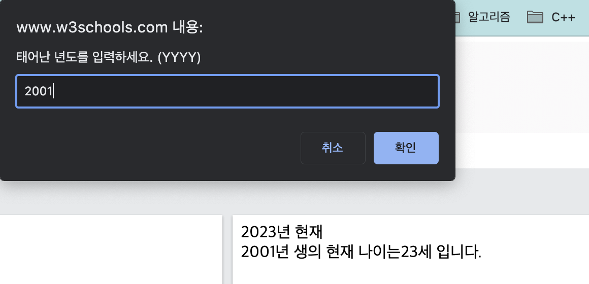 <!DOCTYPE html> <html lang="kor"> <head> <meta charset="UTF-8"> <meta name="viewport" content="width=device-width, initial-scale=1.0"> <title>Document</title> </head> <body> <script> var currentYear = 2023; var birth, age; birth = prompt("태어난 년도를 입ㅕ하세요. (YYYY)", ""); age = currentYear - birth + 1; document.write(currentYear + "년 현재<br>"); document.write(birth + "년 생의 현재 나이는" + age + "세 입니다."); </script> </body> </html>
