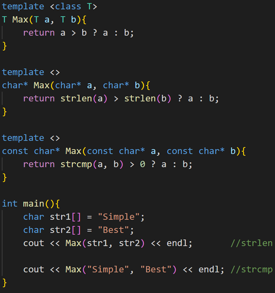 예를들어 int, double, char 타입에 대한 최솟값을 구하는 min 함수를 만들어 보자면 아래와 같이 3개의 함수가 필요하다.