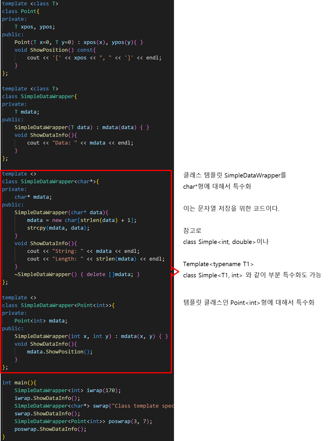- 즉, 템플릿을 구성하는 멤버함수 일부 혹은 전체를 모두 다르게 행동시킬 수 있음