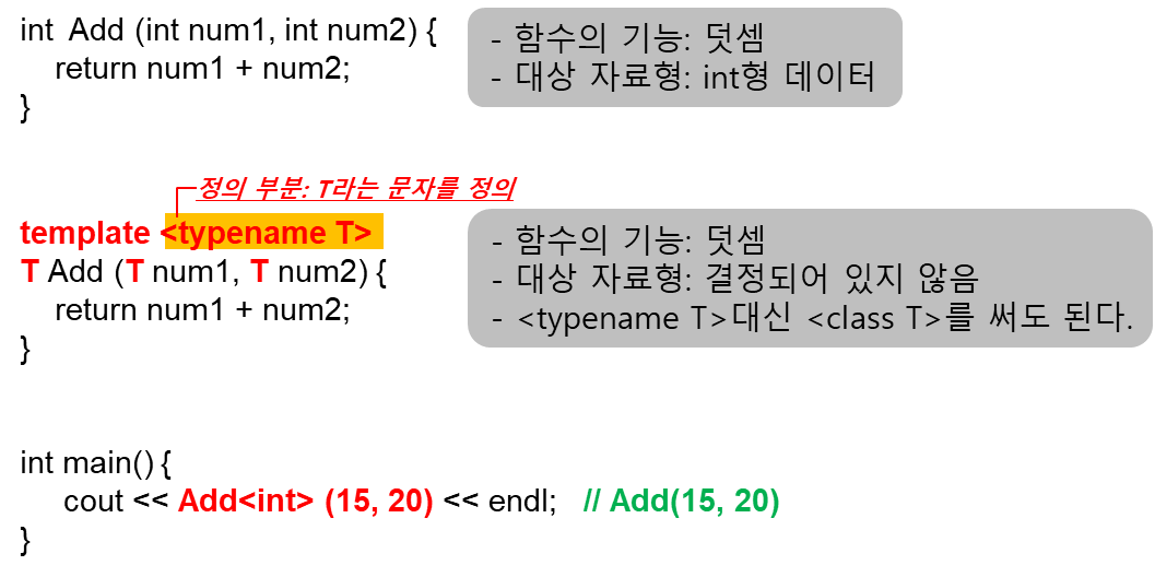 - C++에서 template은 다른 객체지향언어에서 부르는 "일반화를 뜻하는" 제네릭(generic)이다.