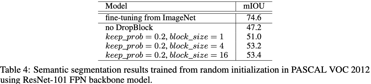 - Object Detection실험에 이어 random initialization에서 훈련 모델에 대한 DropBlock의 효과를 연구한다.