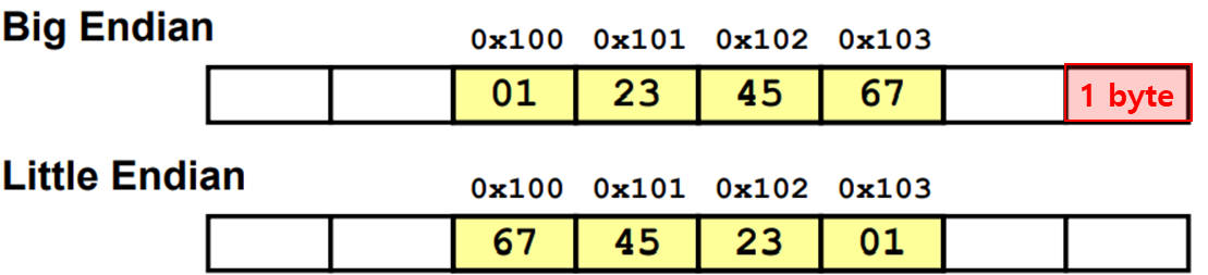 1. Big Endian: Least significant byte (최하위 byte)가 최대주소에 저장된다.